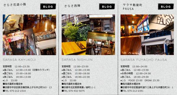 - Sarasa 3:偏時尚、工業風的裝潢,店內有賣酒、披薩和義大利麵,中午都有便宜的午餐。離二條城比較近,在三條商店街裡面,因為2016年搬過家所以資訊還比較少,官網資訊。
