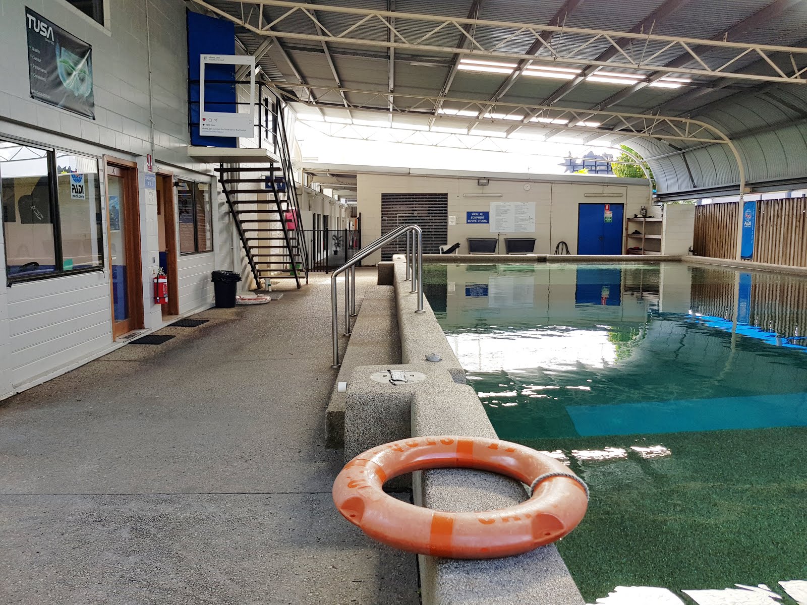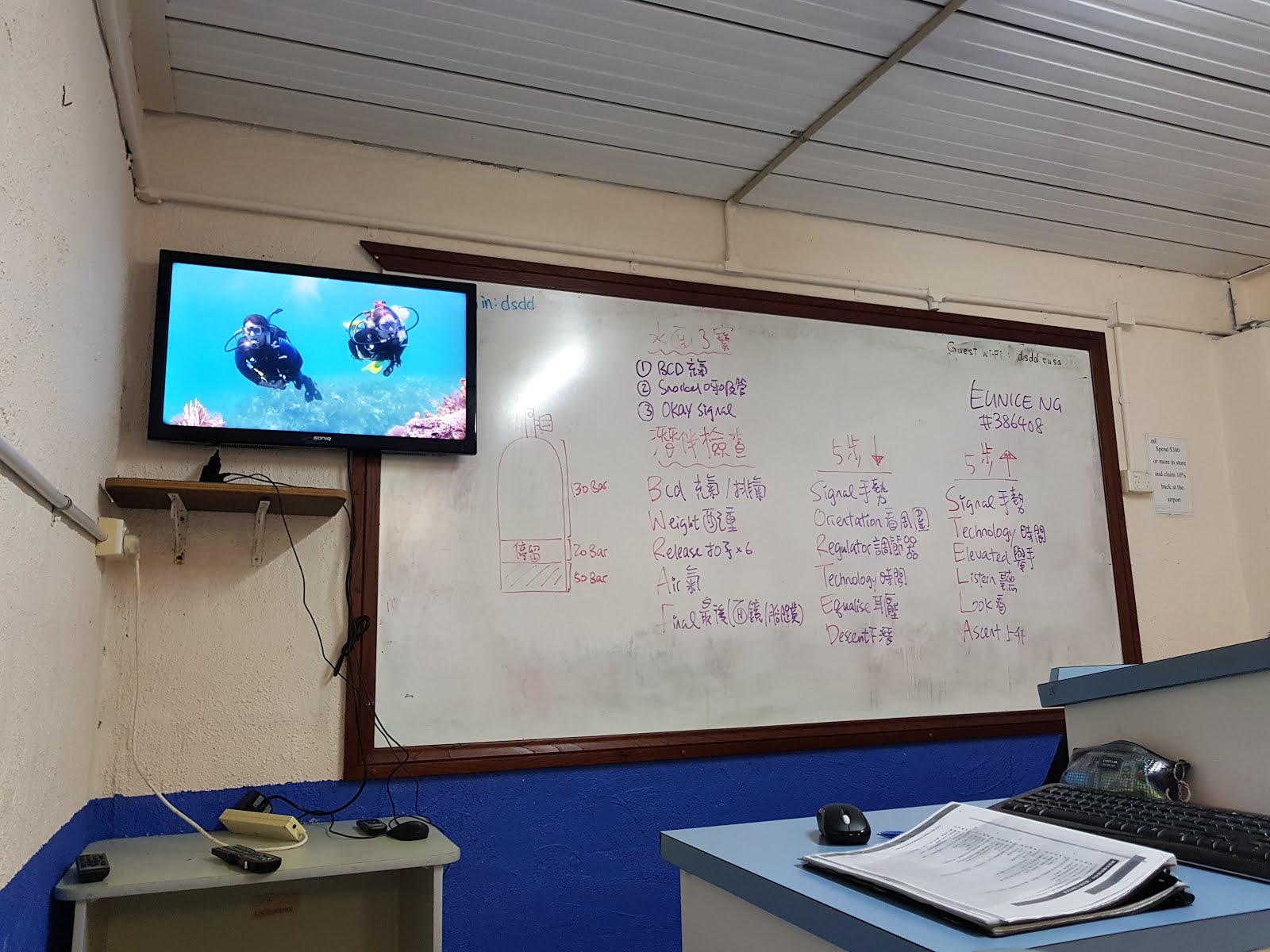 前幾天都會在室內的平靜水域(有深度的游泳池)內練習許多潛水會用到的手勢、裝備的各種使用方法、耳壓平衡、浮力平衡、面鏡平衡、水中穿脫裝備、遇到緊急狀況的應對,等等等等等。另外還有,亞洲朋友通常最害怕的200公尺的游泳考試和10分鐘的踩水。