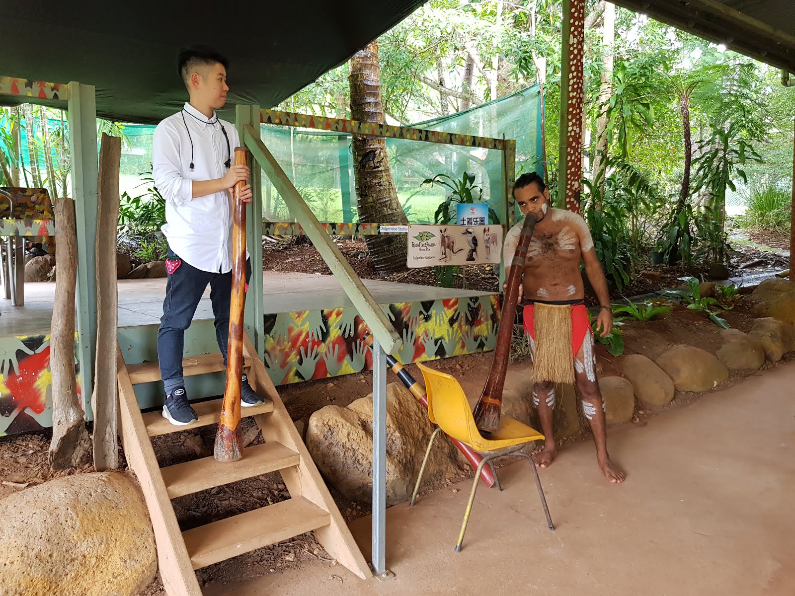 第二個文化是原住民的樂器(Didgeridoo),他們會用這種傳統樂器模仿各種動物的叫聲、而且也有他們特別的呼吸法可以連續不間斷地吹喇叭Didgeridoo。