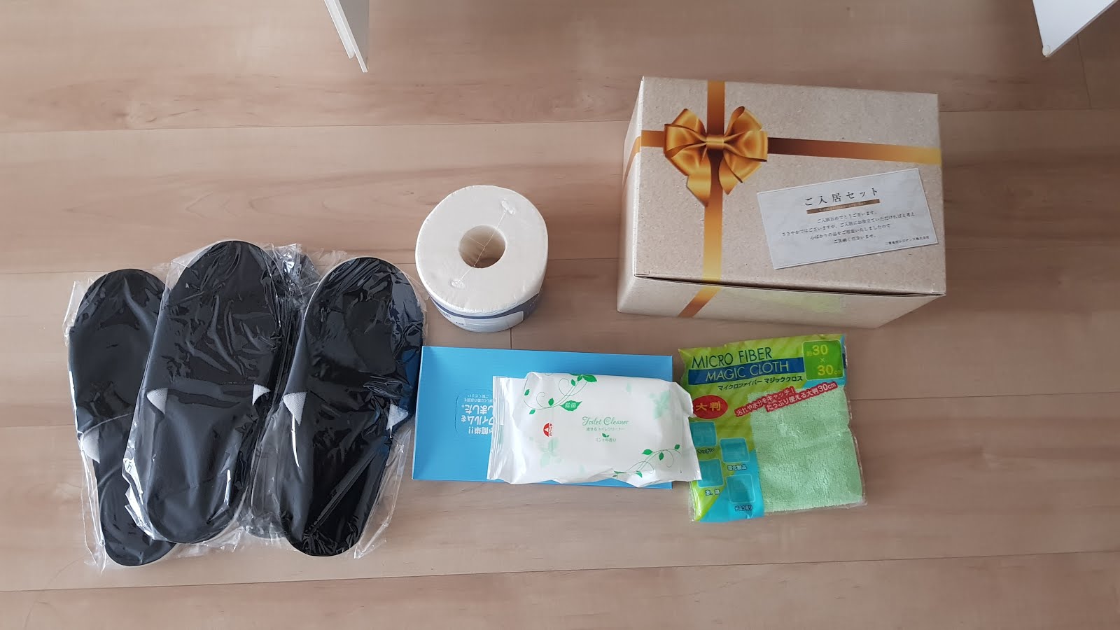 有兩雙拖鞋(品質還比我在百元商店買的好)、廁所和抽取式衛生紙、濕紙巾、抹布各一個