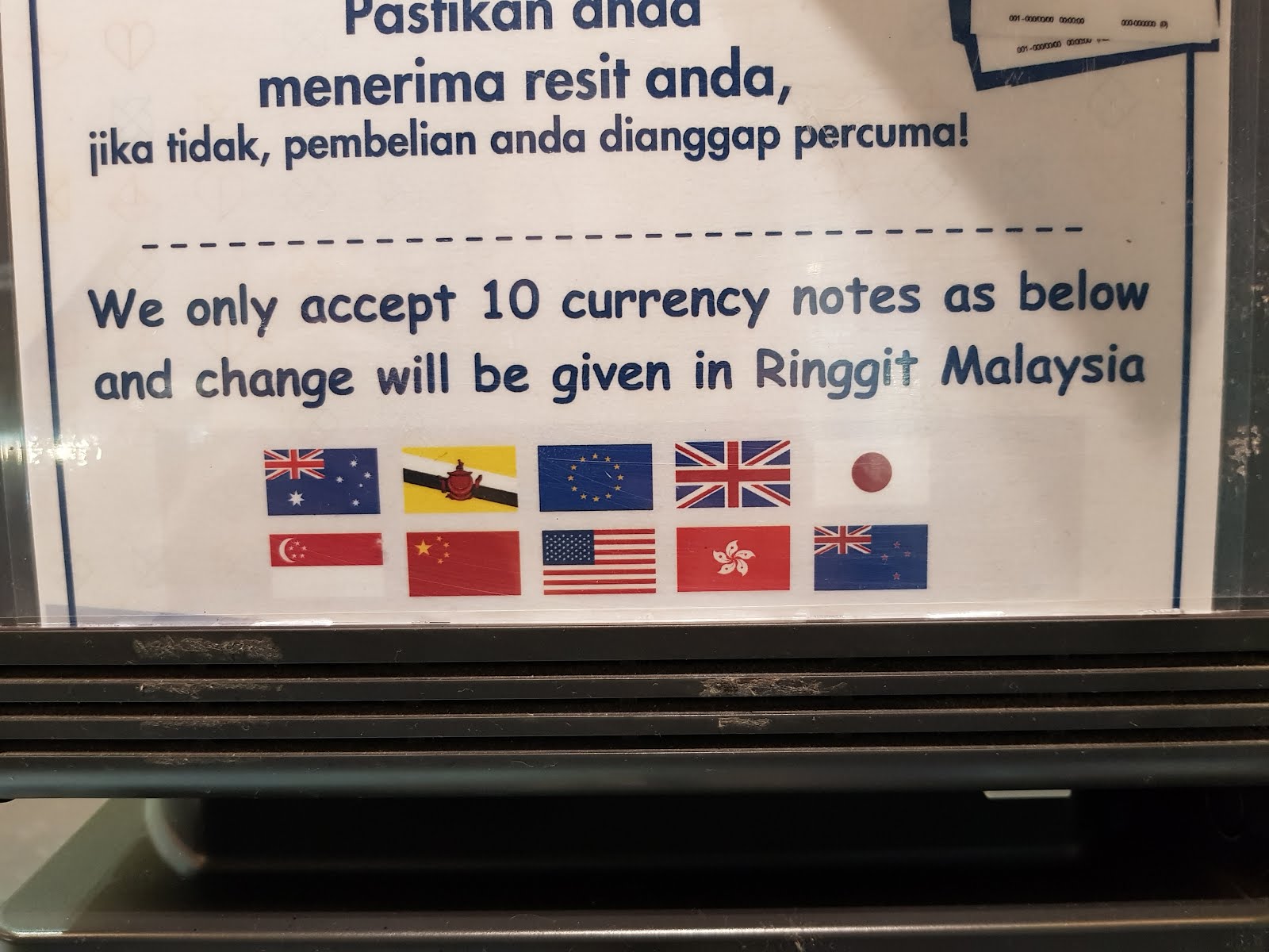 - 交易貨幣:像是日幣、美元、澳幣等等都可以使用,但是會用當時的匯率換算金額後,找你馬來幣,刷卡是看店家,大多可以但少數不行。