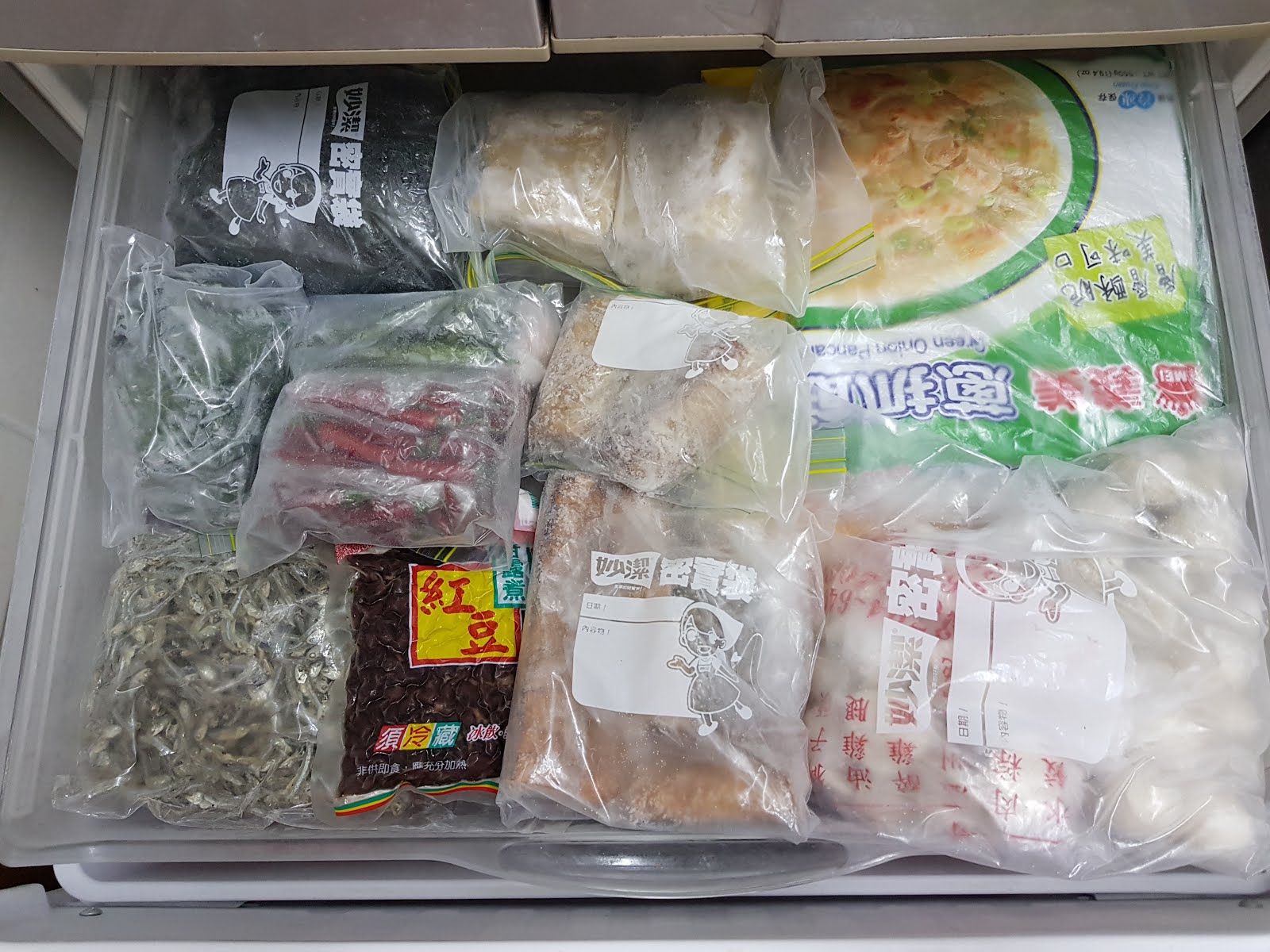- 使用透明夾鏈袋、保鮮膜的分裝技巧進行整理:同部位的放一袋、零散且量沒有很多的物品就同性質放一袋(水餃肉丸、肉類、魚類、香料類等等的分類)