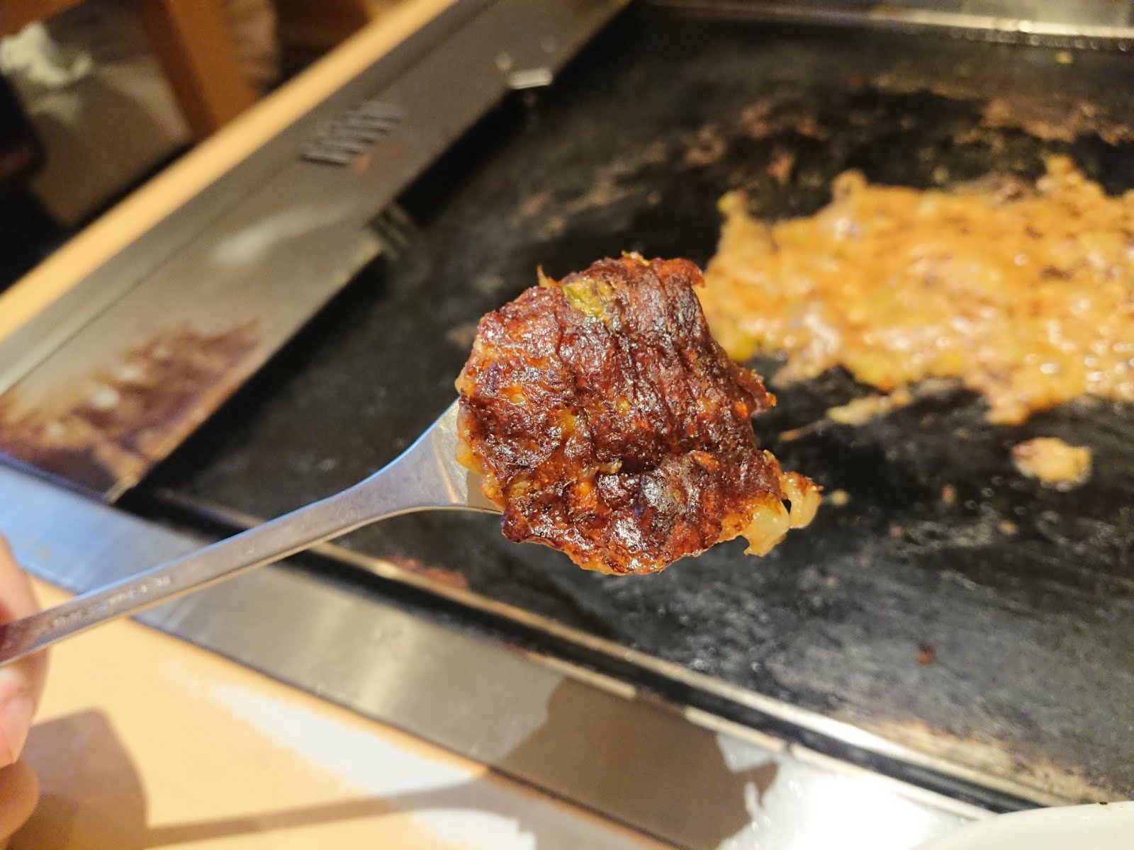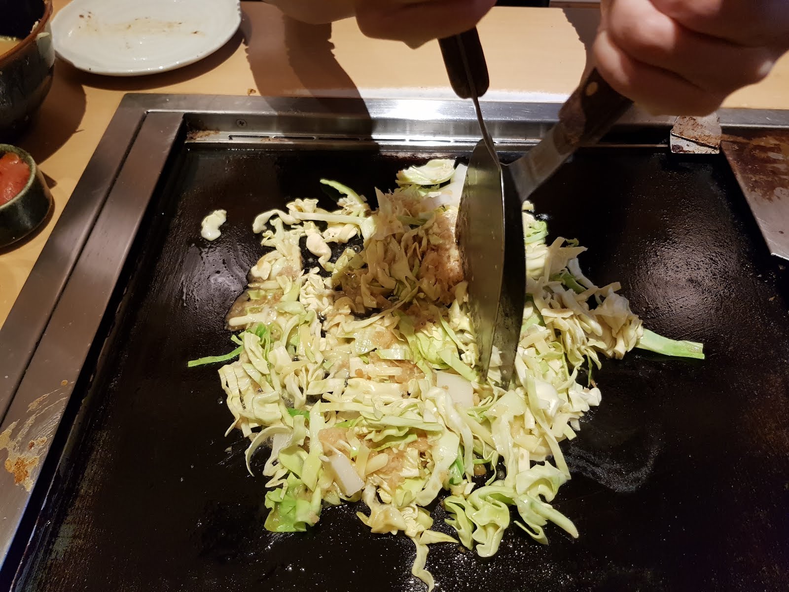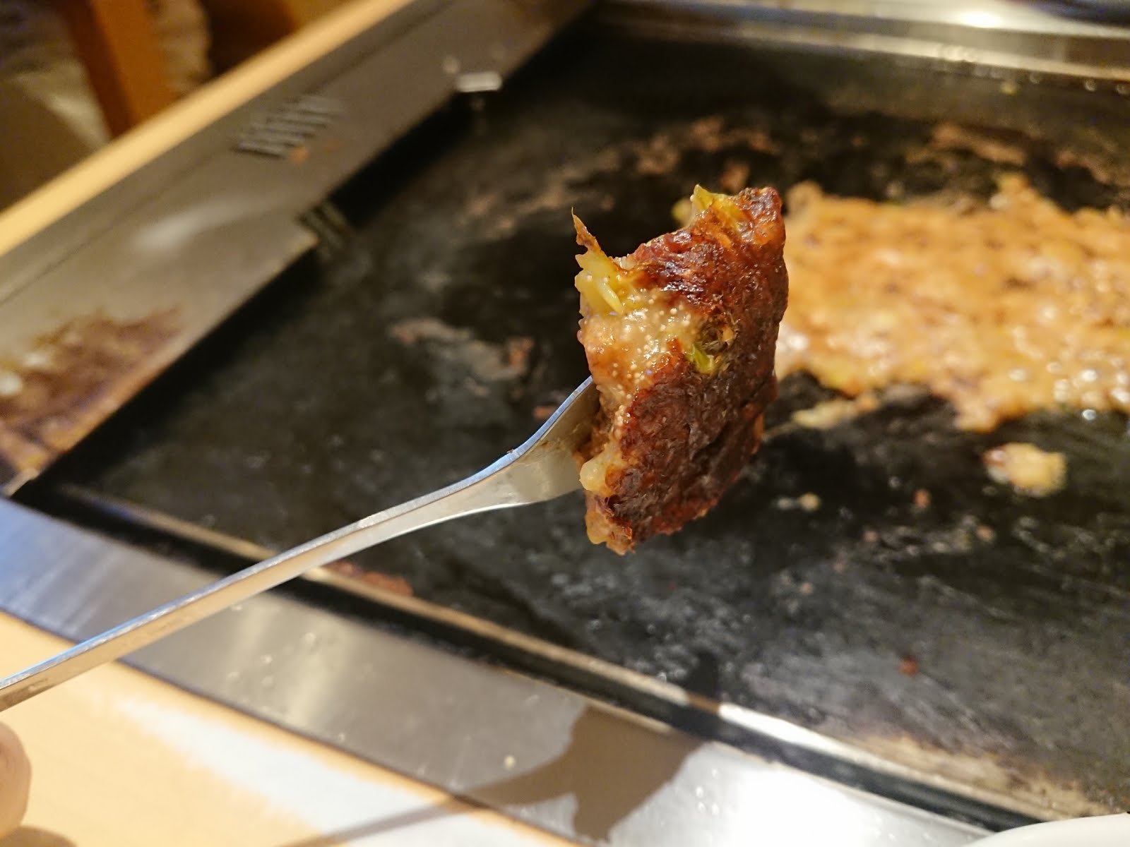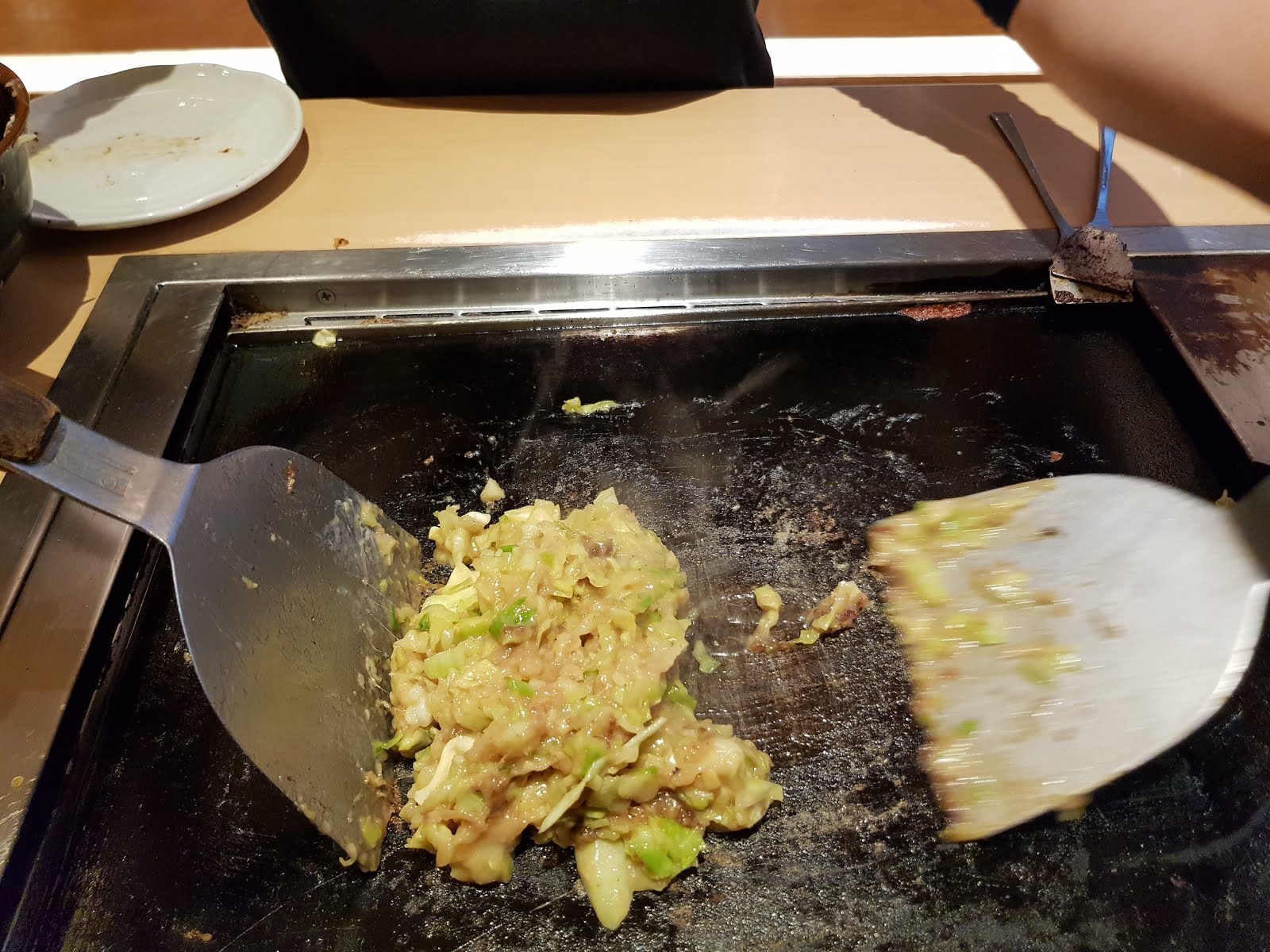 - 第二:先用小鏟子鏟一下自己要吃的部分,將文字燒跟鐵板分開,但不要撈起來、也不用去特別去切開相連的部分