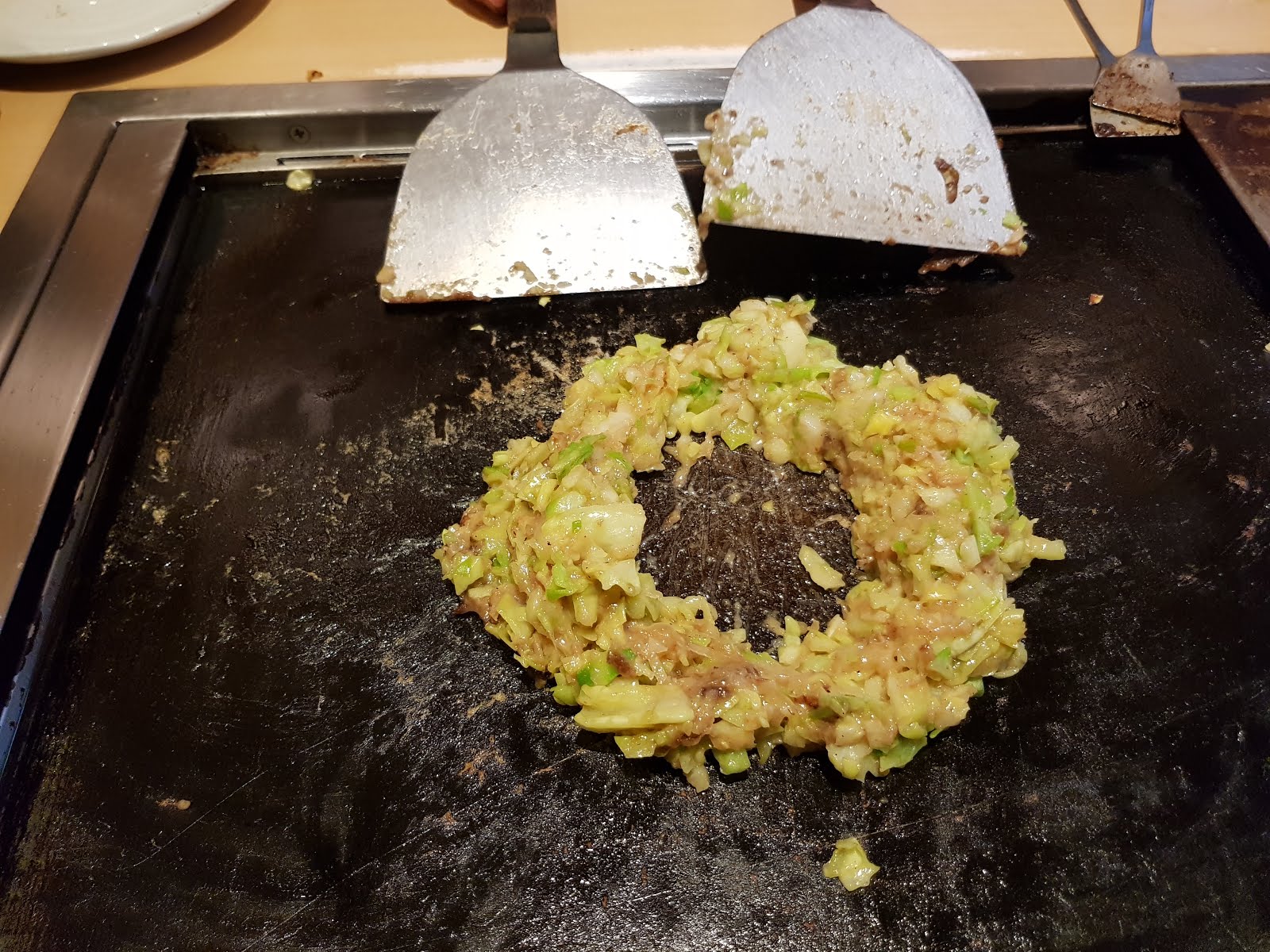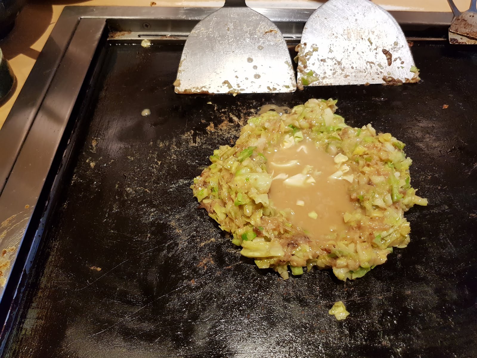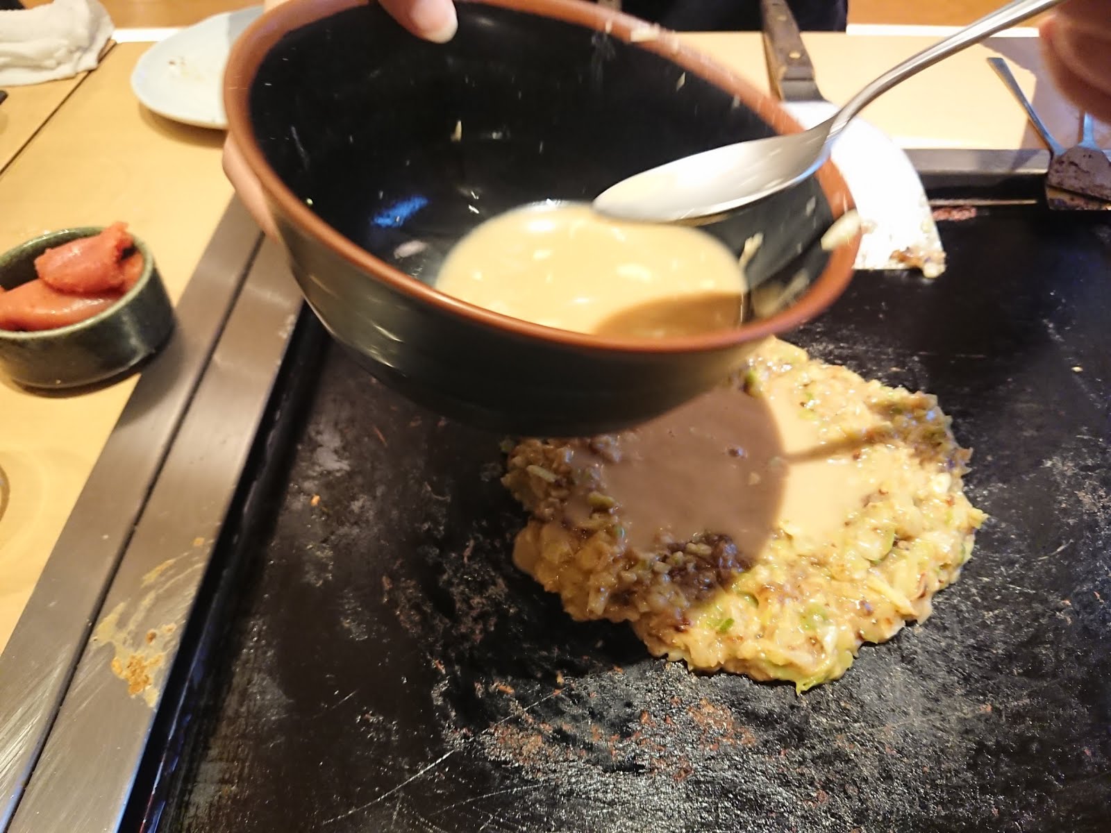 據說文字燒是以前日本戰後食物缺乏,大家就拿麵糊或入水加剩菜拌一拌煎來吃