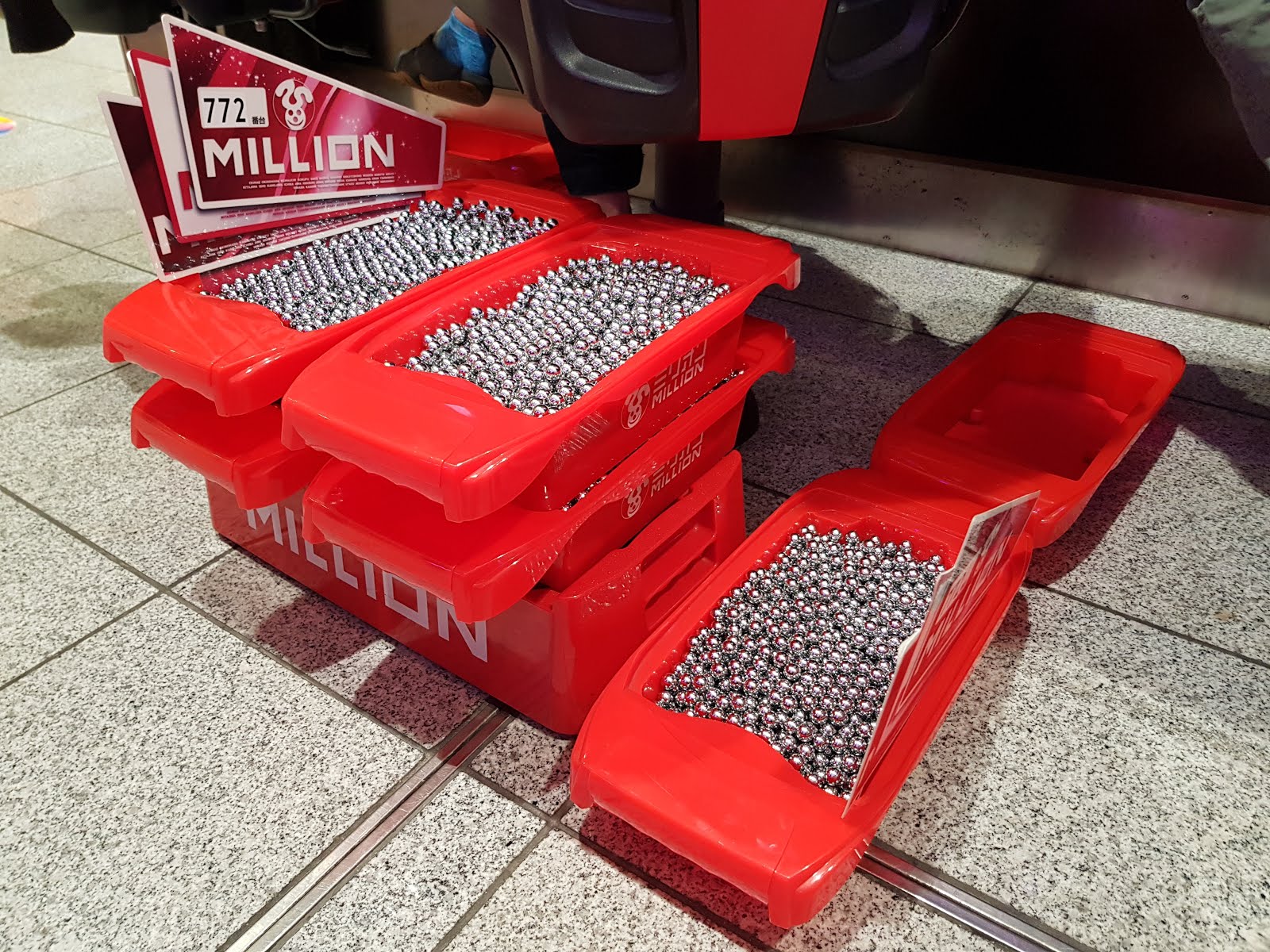 當小鋼珠被打擊、落下後,落入”指定入口處時”,螢幕動畫會被開啟運作,並且機台會掉出3~5顆小鋼珠(小獎勵)
