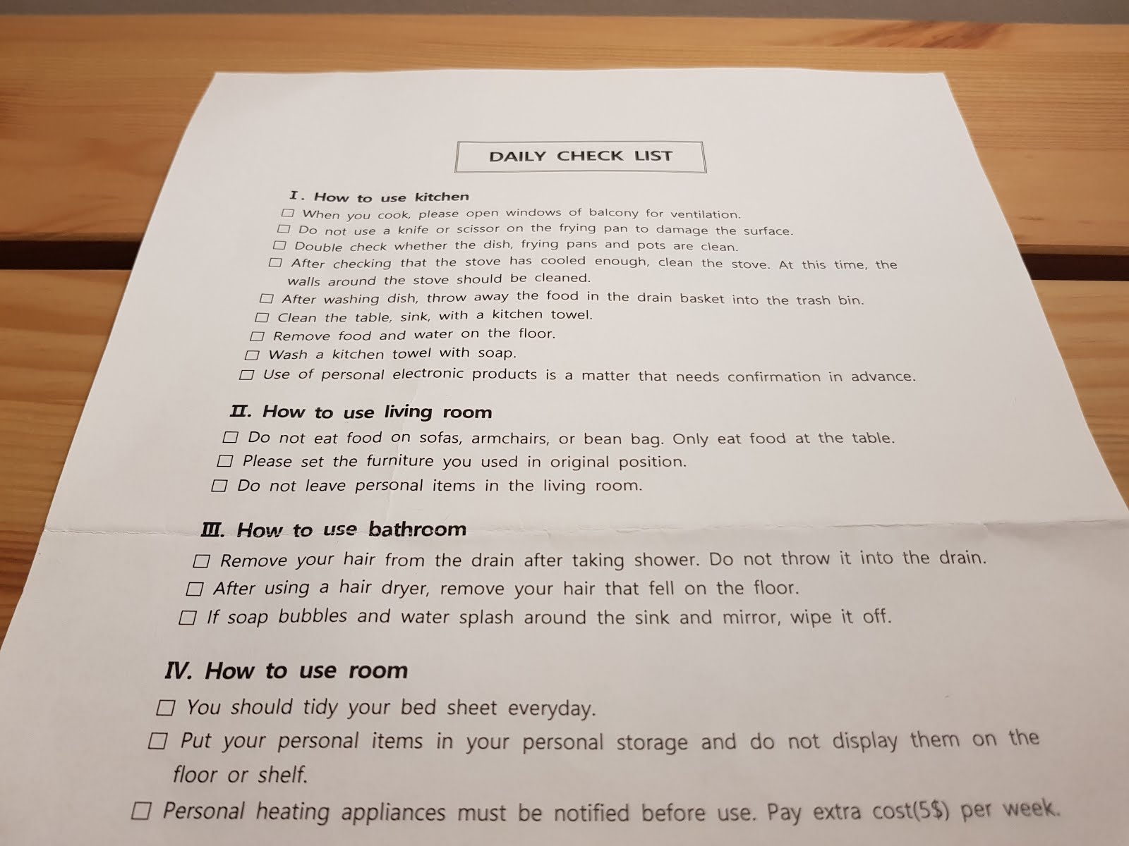 - 每個禮拜要大掃除,工作分配表貼在冰箱上面,如果沒有參與大掃除的話要繳交罰金$5