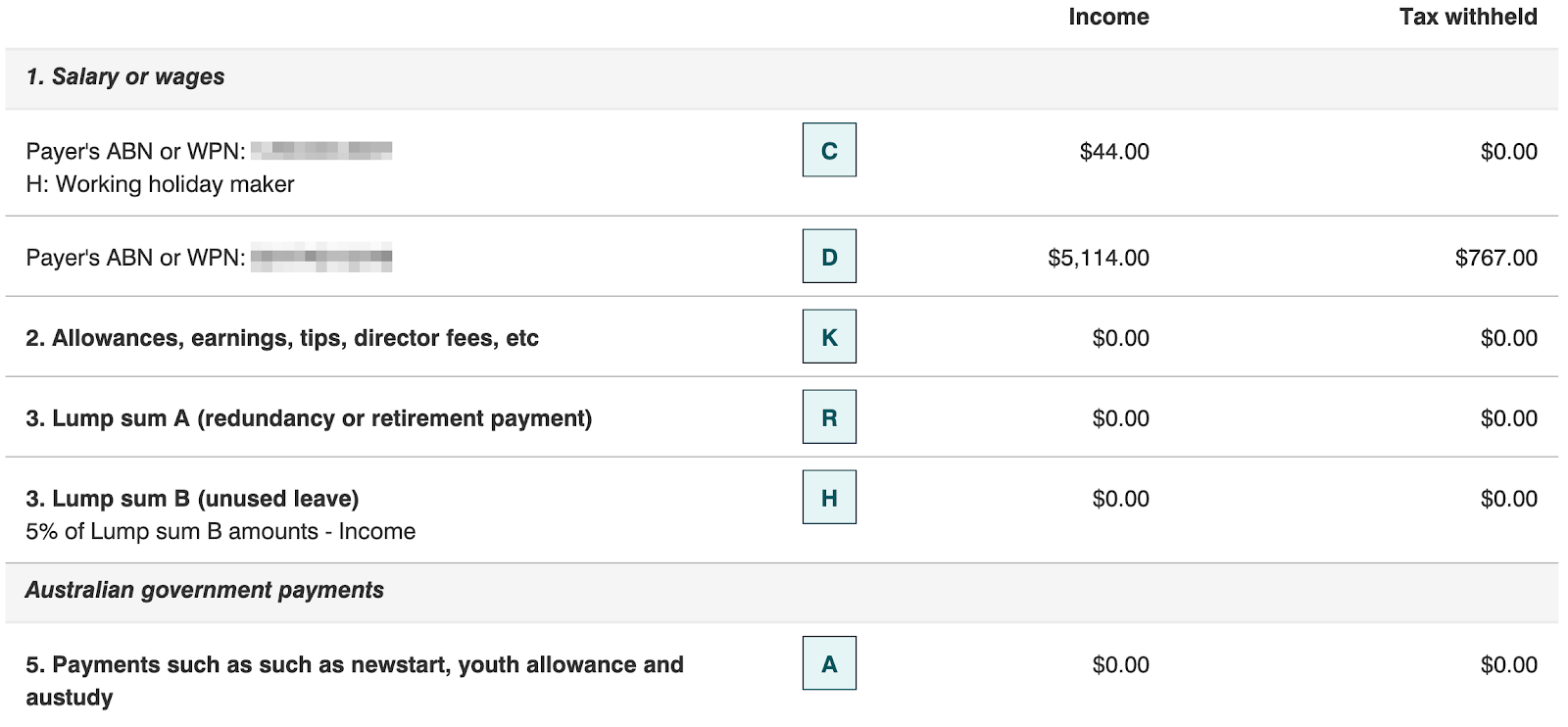 每年公司必須在退稅期間將這張表單寄給你,如果沒拿到的話記得主動跟公司索取,可以是紙本或是電子郵件。內容有如:每間公司資料(ABN)、薪水總額(gross payments)、被雇主預扣的稅(total tax withheld)。