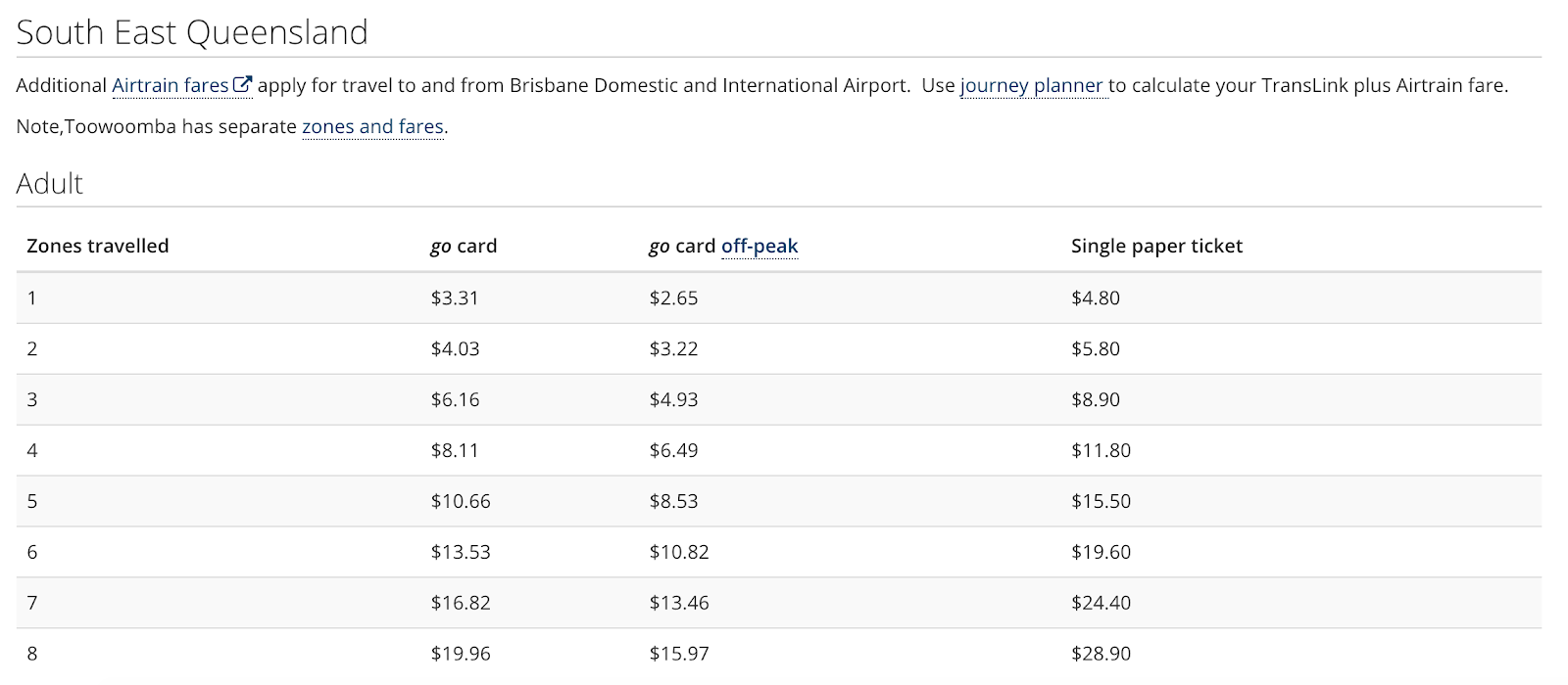 大體來說,黃金海岸-布里斯本這邊算在南昆士蘭(South East Queensland),票價計算方法是分ZONE,南昆士蘭分成8區,從第8區搭到第8區算”跨1區的票價”、從第8區搭到第1區算”跨8區的票價”,票價可以參考這裡。