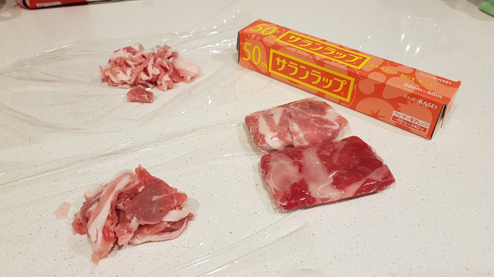- 保鮮膜:原本我也是都用小袋子分裝,不過大小不一,冰箱的冷凍櫃肉都是一球一球,每次使用也是翻翻找找,後來看到日本同事用保鮮膜分裝後才恍然大悟:弄的這樣方方正正的才好排列整理呢,大小也比較好控制,又可以完整密封,好棒呢!(´ω`)